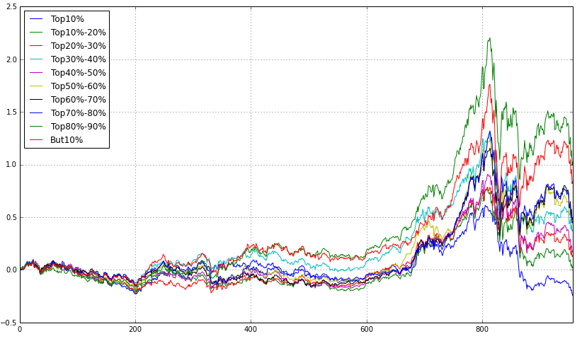 我又接着进行了测试,把沪深300股票池中的所有股票按照收益波动因子分为10等份,等权重买入,分别回测得到如下结果。