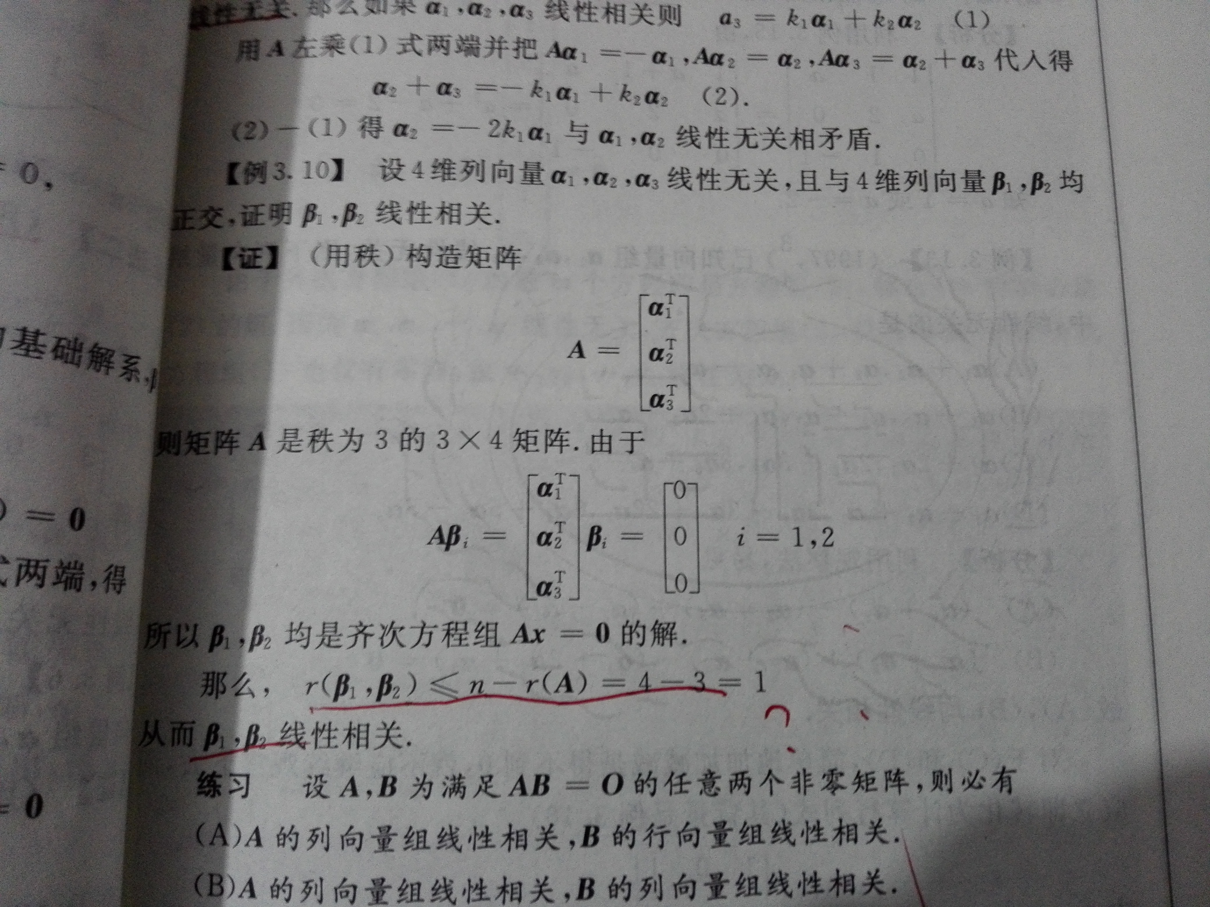 核空间的维数等于阶数减去秩(像空间的维数),而\\beta_1与\\beta_2张成的空间应该是核空间的子空间,子空间的维数应当小于等于空间的维数。