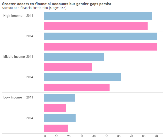 全球范围内,在金融机构开设帐户的女性占比从2011年的47%上升至2014年的58%。但是,在使用金融机构服务方面男性和女性的相对占比差距依旧,在低收入和中等收入国家尤其明显。