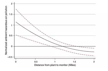 本文采用了类似Difference-In-Difference的实证方法分别,即设定某一距离内的居民为“试验组”,会受到有毒物质排放的影响;而在此距离外的居民为“对照组”且有毒物质排放对他们影响可忽略。然而,应用这一划分首先需要解决如何定义这一距离界限的问题。在考察了工厂运转状态和工厂与监测站间距离对8中主要污染物传播情况的影响之后作者发现,通常排放出的污染物仅在一公里的范围内能被明显检测到,超过两公里则几乎监测不到。因此本文选取居住在离工厂1-2公里内的居民为固定对照组,表示受排污影响较小的群体;而试验组则分别为距离工厂0-0.5公里,0.5-1公里和0-1公里的居民。下图表示了监测到的污染物随距离下降,1公里为分界点。