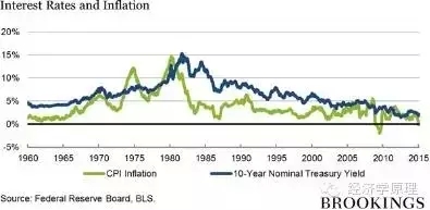 低利率不是短期的反常,而是长期趋势中的一部分。如下图所示,美国十年国债利率于1960-1970年间处在低点,1981年达到15%的顶峰,而后持续下降。其趋势部分可以用图中明显波动的通货膨胀率来解释。其他条件等同时,投资者会在通胀率高时要求更高的利率以补偿被动失去的购买力。但现在“通胀保值债券”(Inflation-Protected Securities)的利率同样很低;实际或通胀调整后的五年期美债利率约为负0.1%。