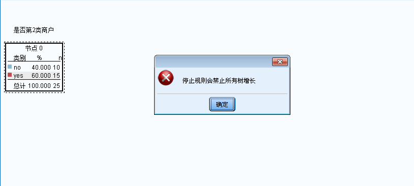 求助:spss modeler决策树中QUEST算法出现“停止规则会禁止所有树增长”什么原因?