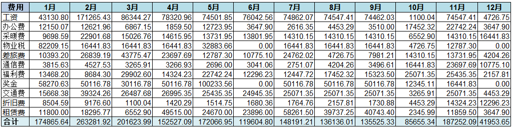 这是一个公司某年1到12月份各项经费使用情况数据表,如图1所示,针对这个数据表,若需要进行数据分析,应该怎样入手、关注什么呢?重点是首行与最左列的数据,首行是关于日期的月份,一年的12个月;最左列是各项费用名称,它们的相交单元格是货币数据,那么我们首先是实施趋势分析,每项费用在12个月中是如何变化?然后观察结构分析,所有项费用在某月使用的状况,最高或最低,支出是否正常?