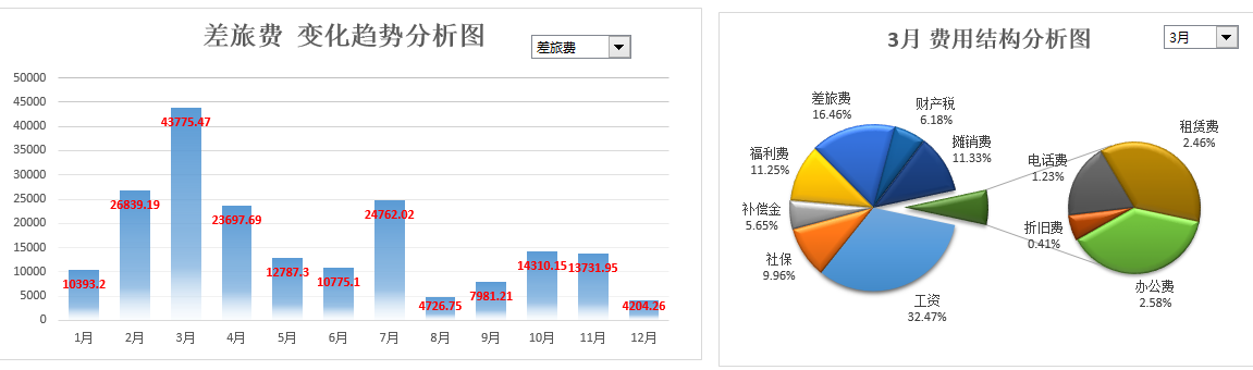 我们需要创建两个图表,如图2所示,使用Excel的“组合框”控件选择不同费用,例如,差旅费或不同月份,例如,3月,以获取不同费用在不同月份的情况、变化趋势或结构分析。
