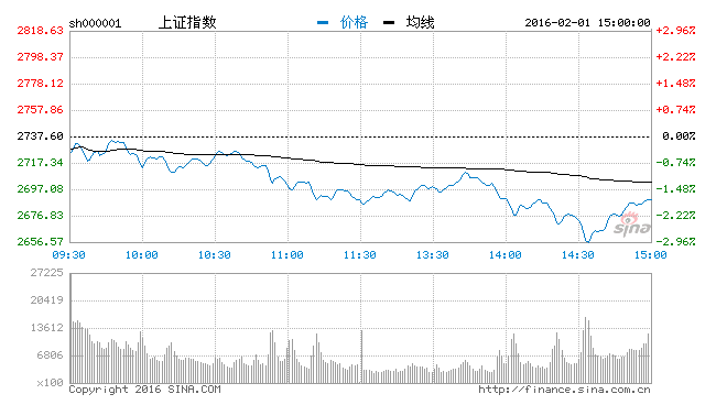 2月1日消息,周一早盘,沪深两市低开,沪指表现弱势并持续震荡下行,午前再度跌破2700点;中小创个股表现抢眼,创业板较为强势,盘中一度涨近1%,但随后也回落翻绿。午后开盘,沪指持续震荡走低,银行、钢铁、煤炭等板块持续杀跌,两市多次跳水,沪指盘中跌幅扩大至3%,低见2655.62点,临近尾盘两市有所回暖,沪指跌幅收窄至2%。