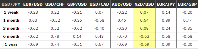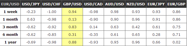 这两组货币对之间有着较强的正相关性,英镑/美元基本上随着欧元/美元一步步变动。