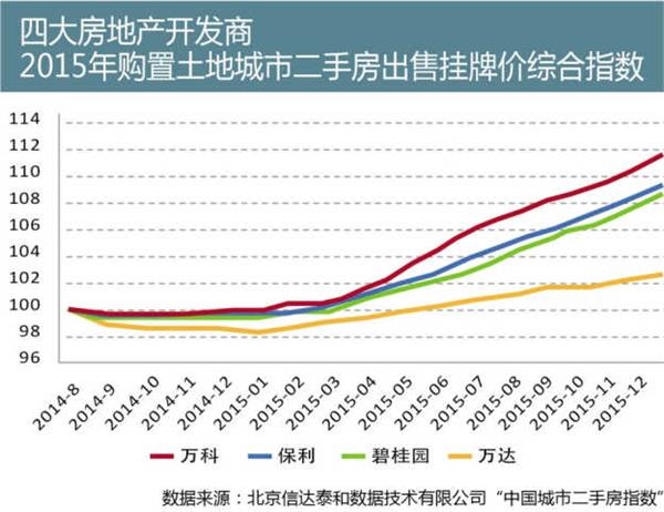 从四大房地产开发商2015年的购置土地城市二手房出售挂牌价综合指数来看,万科指数增长速度最快,2015年12月同比增长11.78%,其次是保利和碧桂园,同比增长分别为9.96%和9.55%,万达同比增速为4.08%。