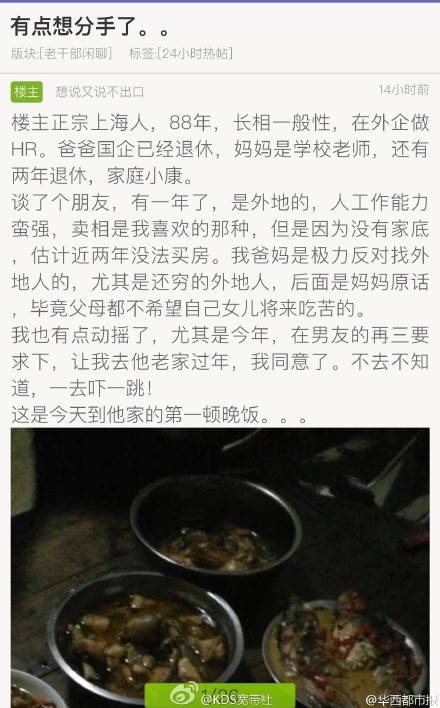 这个春节,一位上海女孩引发广泛的社会讨论。这位女孩春节到男朋友的江西老家过年,却把男朋友家的晚餐发到网上,不仅毅然和男朋友分手,而且连夜返回上海家中。事件虽然尚有疑点,但在春节团圆期间,在人们正为返乡而愁肠百转之时,瞬间戳中了无数人的情感神经。