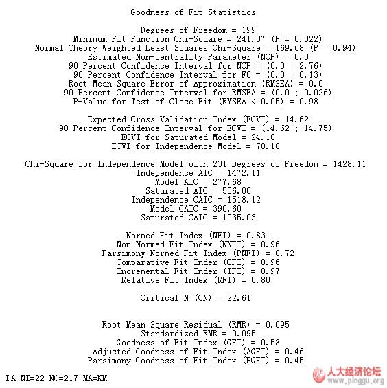 yaogdd 发表于 2009-3-28 15:02 RMSEA<0.05说明你的模型拟合的很好啊,其他指标也都拟合的很好。