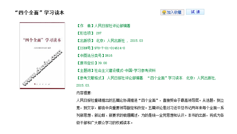 【作 者】人民日报社评论部编著【形态项】 287【出版项】 北京:人民出版社 , 2015.03【ISBN号】978-7-01-014614-0【中图法分类号】D616【原书定价】39.00【主题词】社会主义建设模式-中国-学习参考资料【参考文献格式】 人民日报社评论部编著. “四个全面”学习读本. 北京:人民出版社, 2015.03.