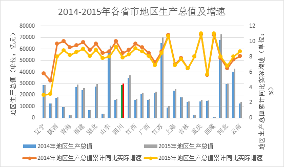 twoway (bar gdp2014 id1,barw(0.4) ) (bar gdp2015 id2,barw(0.4) ) (line gdp_rate2014 gdp_rate2015 prov,yaxis(2) xlabel(1 "安徽",angle(90)) )