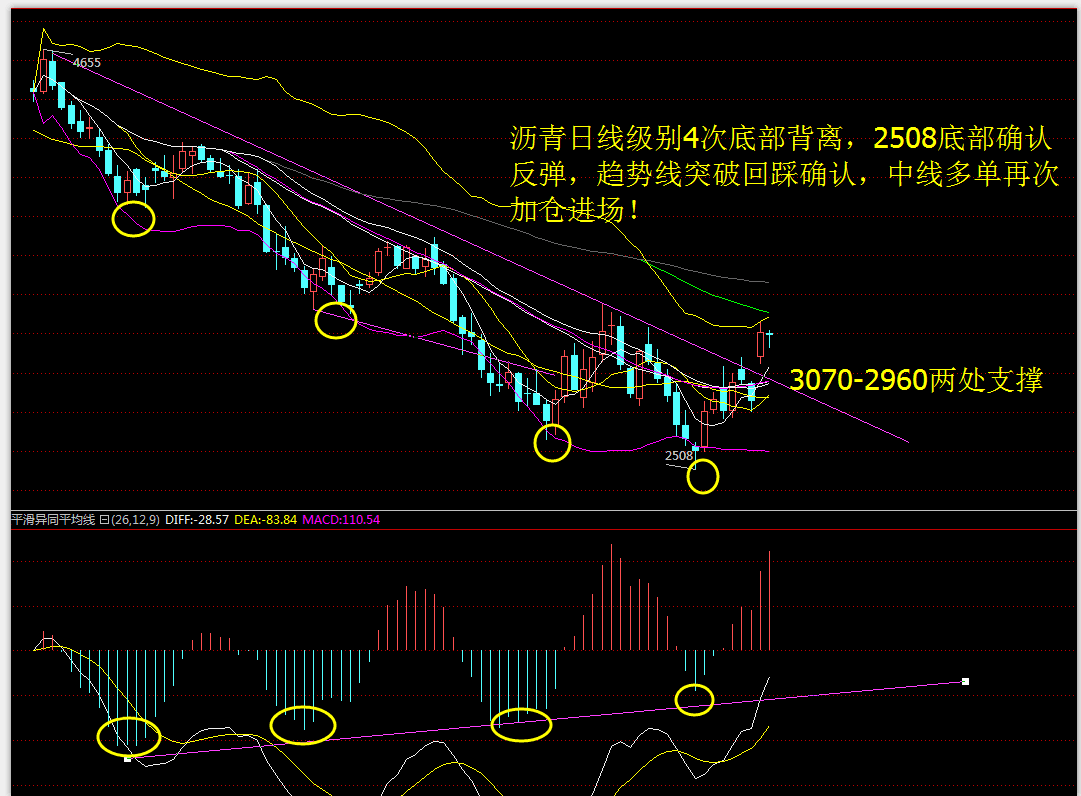日线如图:日线沥青已经形成4次顶部背离形态,上方趋势线已经被上破企稳,目前我们可能更多关注趋势线突破回踩确认做多,前期顶底转换位置3310形成目前上方压制平台,从目前macd配合K线来看,沥青价格突破3310,附图指标macd快线上穿零轴,行情走入加速上扬阶段。操作上我们都是等待回踩做多,对于回踩下方我们需要关注3070-3010,强支撑也是缺口回补位置2960-50一线,可以分批布局多单。