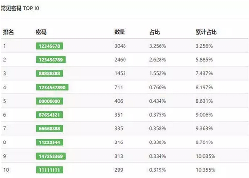 从列表中,前三名的密码是12345678,123456789和88888888。这三个密码的总数是7.437%。不要低估了这7.437%个,实际上,这已经被认为非常可怕的比例。因为在9个WiFi信号的情况下,WiFi能够突破这三个密码的概率为50.1%!写下这三个密码,有一天会救你一命。