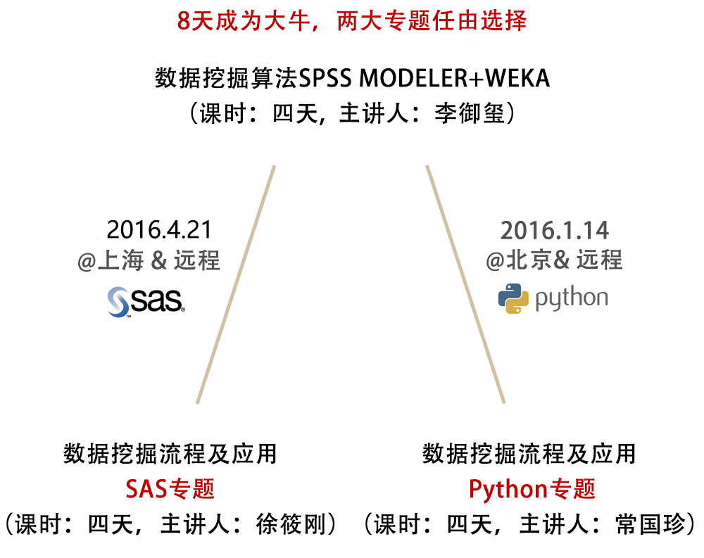 在建模分析师中,数据挖掘(Data Mining)技术无疑是他们最强有力的核心竞争力。数据挖掘强调与现有信息系统的整合,以提供决策者做决策时所需的情报,或转化成经营智慧,以作为调整营运策略方针的辅助工具。以顾客关系管理(CRM)为例,数据挖掘是整个顾客关系管理的核心。其不但可以准确的定位目标市场,进行精准营销,还可以帮助业务人员了解客户深层需求,针对大量客户进行客制化,也就是所谓的一对一营销。本课程的目的就是要针对数据挖掘整套流程,根据CDA Level Ⅱ大纲标准,以金融、电信、电商和零售业为案例背景,第一阶段结合SPSS Moderler和WEKA深入讲授数据挖掘的主要算法。第二阶段将分为SAS专题和PYTHON专题,学员可以根据自身的需求任选一个专题,培训中将软件与SQL有效的结合,讲授如何在实际工作中搭建数据挖掘环境,制定分类数据挖掘的标准流程,让学员胜任全方位的数据挖掘运用场景。