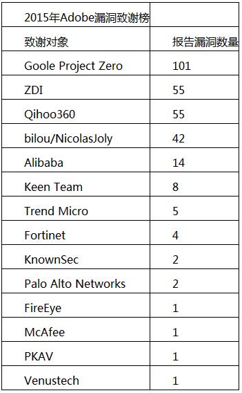 接下来,我们将对Adobe、Apple、Google、Microsoft四个影响数亿用户的漏洞“大户”进行2015年盘点,看看都有哪些黑客团队荣登这些厂商的漏洞致谢榜。