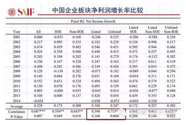 2000-2014年间,上市公司的平均净利润增长率小于非上市公司的增长率,而上市公司的净利润增长率与GDP增长关联性仅为0.39(统计上不显著)。相比之下,非上市公司的净利润增长率与GDP增长的关联性高达0.71(统计上很显著),这表明,中国的GDP增长绝大部分并不是来源于上市公司,而是非上市公司,尤其是非上市的民营企业。