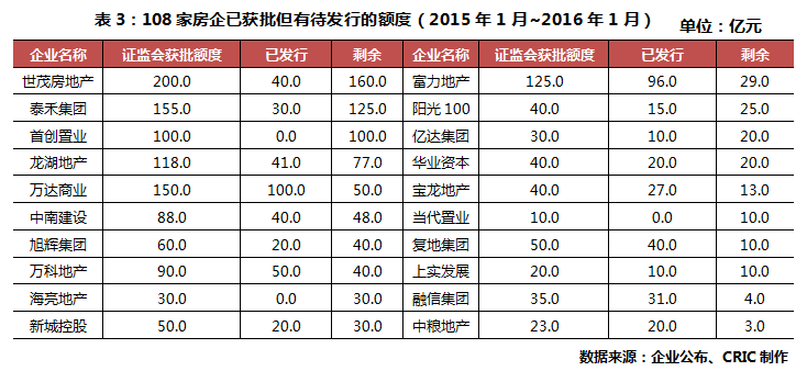 就108家房企2015年1月至2016年1月公司债获批的情况来看,目前仍有844亿的额度有待释放,可以预期,若国内宽松的融资环境保持不变,未来公司债的热潮还将持续一段时间。