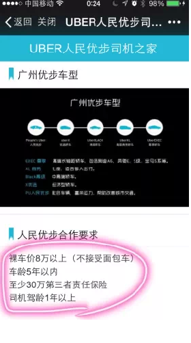 人民优步的车型,要求并不高,8万以上的车即可,虽然很多豪华车主由于好奇在陆续加入,但并不因为他们的豪华车型而形成不同的价格(我是针对人民优步而言)。也就是说,豪华车由于油耗大,如果真要做这门生意的话,反而是赚不过低价车型的。这点看上去不公平啊,你提供了豪华车给用户装逼,却不能收更高的价格,心中自是不平。