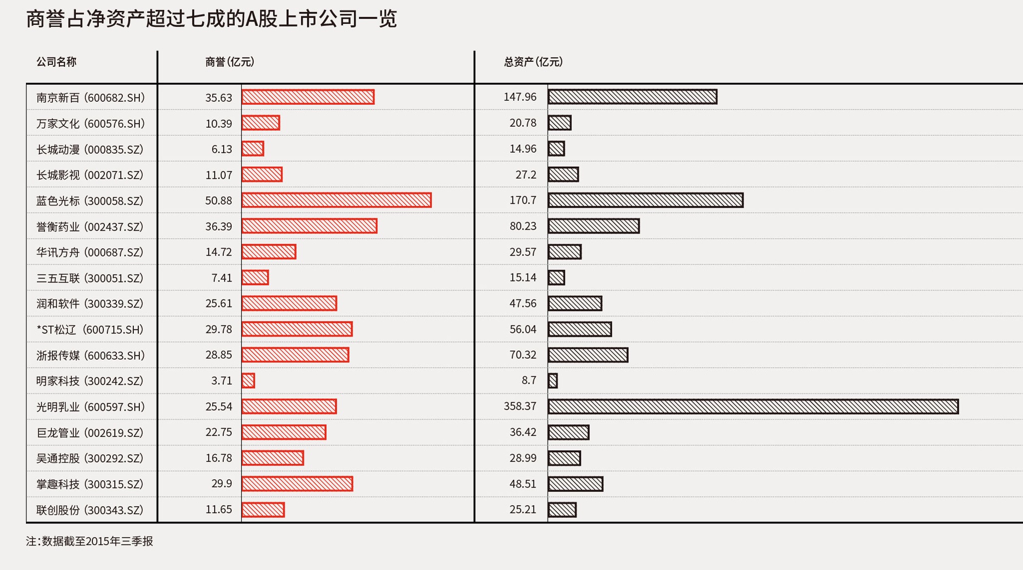 以商誉占净资产比例最高的南京新百为例,截至2015年三季度的商誉为35.63亿元,净资产为16.4亿元,商誉是净资产2.17倍,当季净利润亏损9300万元。这家于1993年上市的公司,此前一直以百货零售为主业,1999年新增房地产开发业务,2001年投资制药行业,2012年新增物业管理,2014年并购英国HoF百货。