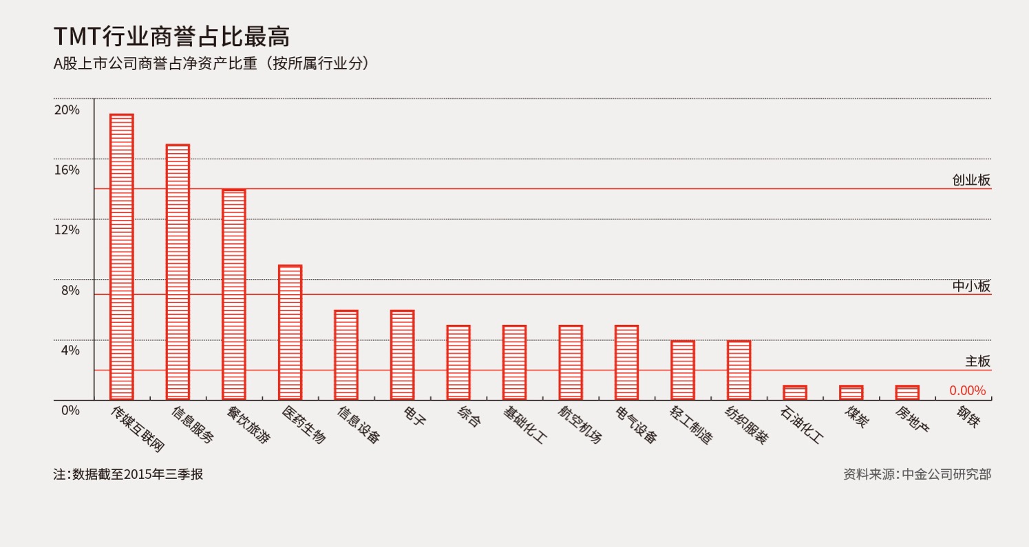 Wind数据显示,目前在1444家有商誉的上市公司中,创业板和中小板共746家,超过50%;两个板块的非金融企业商誉占净资产比例分别达14%和7%,远超主板的2%。占沪深两市总市值24.76%的创业板和中小板公司,商誉合计占到两市商誉总额的40%。