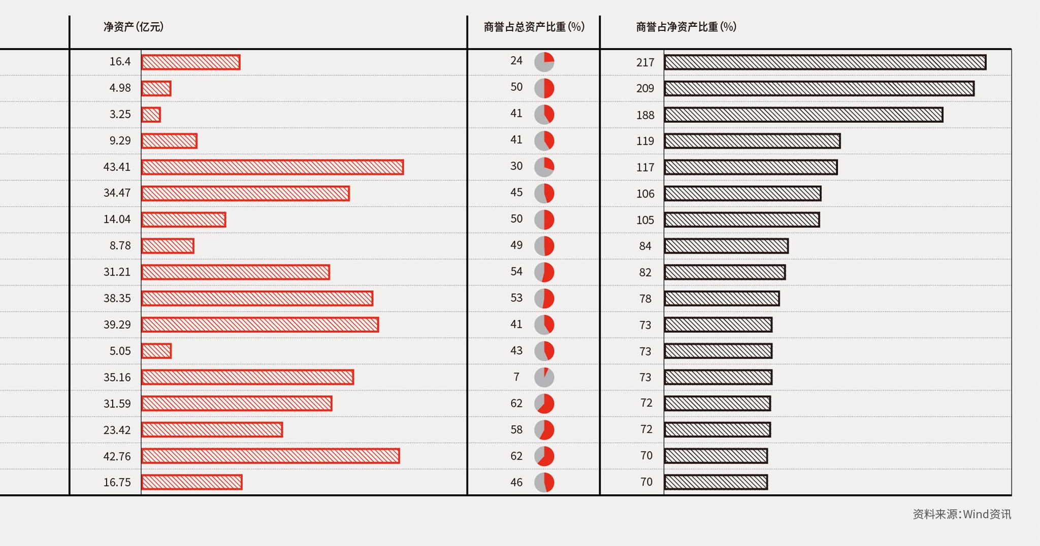 对收购标的的前景展望太过美好,对业务整合效果过于乐观,再加上对赌协议和业绩承诺,谈判过程中极易高估收购标的价值,溢价并购、天价并购层出不穷。王汉锋分析,“并购市场的活跃以及资本市场的繁荣,也使得被收购公司同样估值高企,不少被并购资产的估值明显超过其账面价值,这会导致A股市场上商誉占净资产的比例加速上升。”