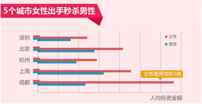 从人均投资金额来看,深圳、北京、杭州、上海和成都等多个城市女性的投资金额都高于男性。其中成都女性人均投资额是男性的三倍之多。