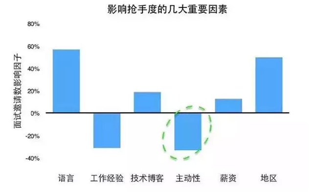 负相关的两个因素是:工作年限与求职的主动性。每个主动求职者平均收到5.6个面试offer,被动求职者则为8.4个,说明被动求职者正是因为具有市场上更为紧缺的技能所以不会急于换工作。