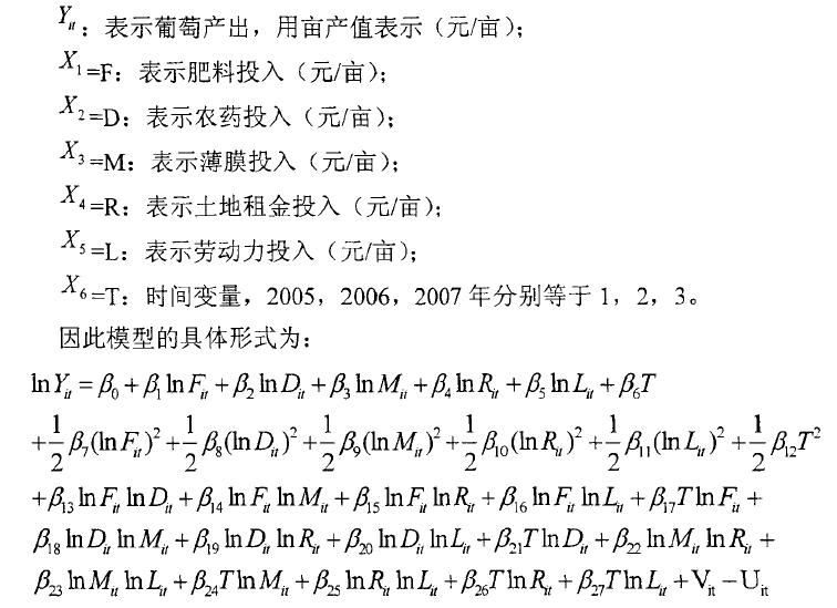 CharryLee68 发表于 2016-3-5 10:36 内容摘自文献《温岭市农户葡萄生产技术效率分析》 超越对数随机前沿模型原型为 带入变量后的模型公式为
