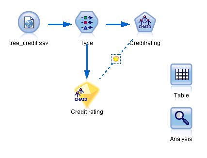 该流中还包含表节点和分析节点,当创建模型块并将其添加到流以后,可使用这两个节点查看评分结果以评估模型。