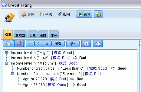 与预期的一样,预测值与大多数(并非全部)记录的实际值相匹配。原因是每个 CHAID 终端节点均包含混合值,而预期值与大部分结果相匹配,对于该节点中的其他结果,该预期值是错误的。(还记得节点 2 中 16% 的少部分低收入客户其实是没有拖欠的吗?)若要避免出现此情况,可继续将树分割为更小的分支,直到每个节点都不含混合值 (100%) 为止—即全部为优良或不良。但是,这样的模型会非常复杂,并且不易推广到其他数据集。