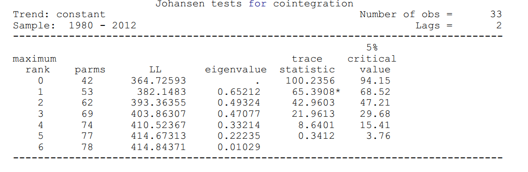 迹检验1个显著,打星号的那里,说明存在一个协整关系。