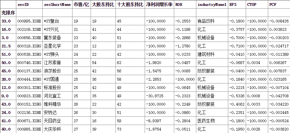 最后按照每股收益、现金流市值比、市现率、大股东占比和市值等权重排名得出最有壳价值前60家上市公司得到股票: