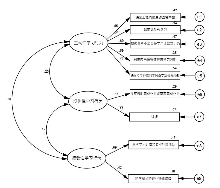 wencong002 发表于 2016-3-16 22:41 如图,比如潜变量规则性学习行为在观测变量没有按时完成作业或草率完成作业上的路径系数为0.53,0.53意味 ...