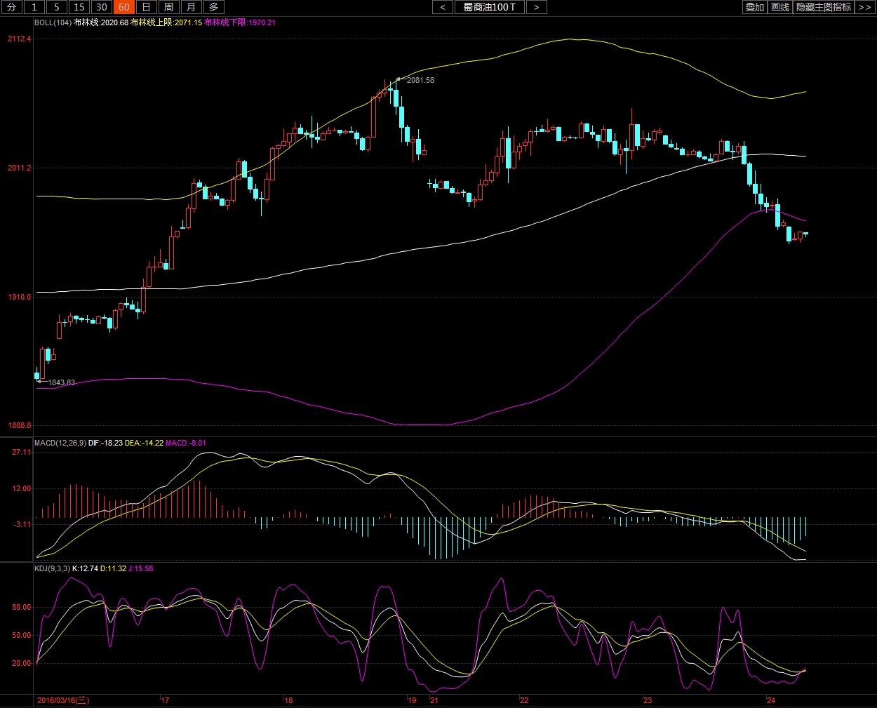 蜀商油技术面分析,小时图boll中轨道小幅往下,上下轨道开口,macd死叉往下发散,但有拐头迹象,动能柱绿柱缩减,kdj金叉往上发散。4小时图boll中轨道往上,上下轨道缩口,macd死叉往下发散,动能柱绿柱缩减,kdj死叉往下发散但有拐头迹象。故此今日操作低多为主,高空为辅。激进者现价1960附近轻仓多单入场,1930破位止损,目标2000-2020。稳健者等待2000-2020分批布局空单,2045破位止损,目标1960-1940.