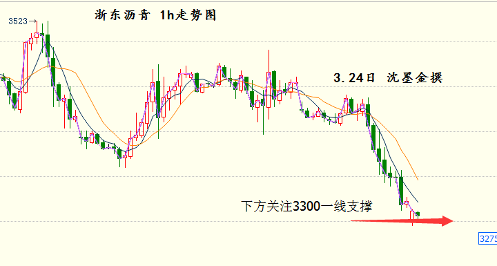 周四(3月24日)国际油价因EIA库存暴增承压重挫,美油价格再度跌穿40大关下行4%,且为油价提供长久反弹支撑的原油冻产协议或是镜花水月;浙东沥青从沥青的的盘面情况来看,昨日价格在EIA数据大幅利空之下快速击穿下方支撑一度跌落3300关口附近,这一点从小时图中没有看到一根像样的阳线就可看出。