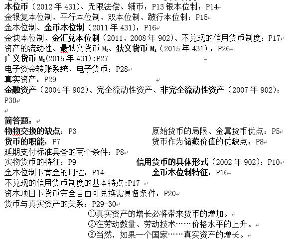 ③我的资料只包含货币金融学这本书上的内容,《国际金融学》和《公司理财》的复习资料我还没整理出来,重点都在我书上。国金的资料预计过几天我才弄得出来。至于《公司理财》,我本科学的财务专业,所以我都用的我学校发的课本和老师的讲义。罗斯的《公司理财》我也买了,不过我觉得这本书拿来考试,有点扯…老外的书编的好,但是拿来背我个人觉得有点无从下手的感觉~~~(各位大可背罗斯那本书,我刚才说的仅仅是自我感觉)。
