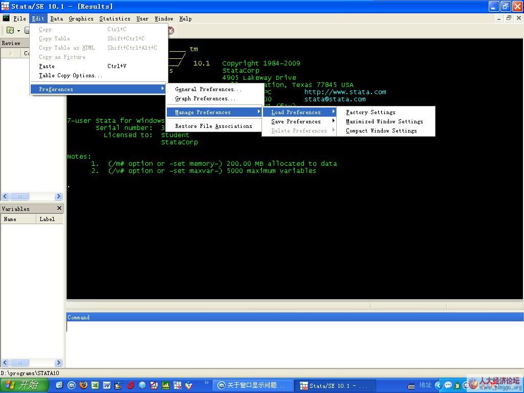 平常使用stata10(论坛上下载的免安装版)时,都正常,昨天可能是同时打开的程序多,stata程序死机,关不了,我就挪动了命令窗口(command),结果窗口(results),记录窗口(review)等,还是关不了。最后通过任务管理器倒是硬性关了stata程序,等我重新打开stata使用时,发现结果窗口不见了,并且命令窗口和记录窗口都不在主窗口下面了。重新关机开机,重新下载使用,还是存在同样的问题。请各位高手指点如何恢复窗口默认设置,在论坛上看到有人说Prefs -> Default Windowing,就可以,但是我的菜单栏里没有这项阿,且Window菜单中也没有Default设置选项。