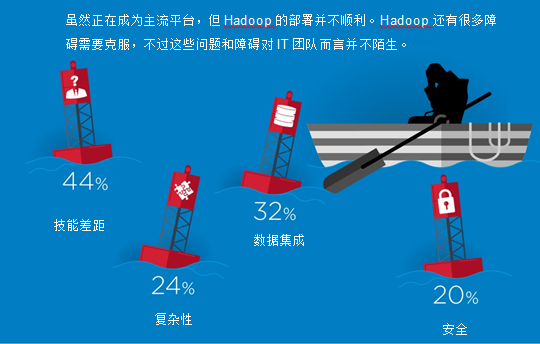 遗憾的是,认识到Hadoop的潜力与真正实现其价值之间存在相当大的差距。技能短板是Hadoop面临的最普遍问题 (44%)。受访者还关心如何整合往来于Hadoop的数据 (32%),以及如何满足安全和监管规定的要求 (30%)。