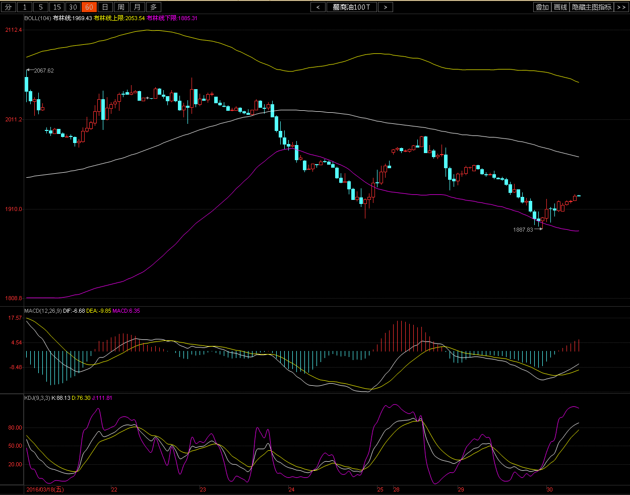 蜀商油技术面分析:小时图boll三轨道往下,macd金叉往上发散,动能柱红柱放量,kdj金叉往上发散,但有拐头迹象。4小时图boll中轨道小幅往上,上下轨道收口,macd市场往下发散,但有拐头迹象,动能柱绿柱缩减,kdj金叉往上发散。故此今日操作低多为主。激进者现价1924附近轻仓多单入场,1884破位止损,目标1960-2000-2050.晚间EIA预测最大可能为利多。EIA预测目标2000-2040-2080.