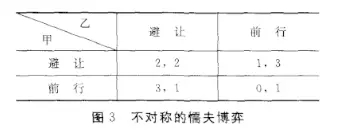 懦夫博弈当然也不例外。前述典型的懦夫博弈模型中设定的收益值都是基于行为体的实力对称,而如果行为体的实力是不对称的,则相应的收益必然会发生改变,从而改变最终的博弈结果。就像两辆赛车一样,其马力、性能和速度都被假设为相同,所以它们的利益计算也是一样的:如果迎头相撞,结果是双方都车毁人亡。正是这一基于实力对称的假设左右了双方的选择(收益矩阵),使得不敢斗狠的一方成为博弈的失败者。但如果一辆是马力超强且不怕碰撞的高性能车(乙),而另一辆则是性能落后且脆弱的旧车(甲),一旦两车相撞,后者所面临的后果可能是车毁人亡(收益为0),而前者可能只是部分或轻微受损(收益大于0)。由此我们可以假定,对乙来说,与选择避让保住车子无损但失去面子相比,选择车子轻微受损但保住面子的收益是相当的,其值为1。这就极大地改变了收益矩阵,使得乙方前行(收益为3)、甲方避让(收益为1)很可能成为唯一的纳什均衡。因为在甲方前行(收益为3)、乙方避让(收益为1)这一策略组合中,乙方将发现,他如果改变策略选择前行,收益并不会下降(同样为1)。