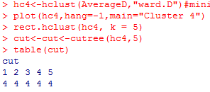 请教下大家哦,我做完聚类分析,输出结果如图,>cut 的4 4 4 4 4的结果表示生成了五个组,每组四个元素,在我的例子里每组4个x, (五个组本来一共是X1到X20),然后我想查看每个组里的内容,但是再输出>cut[ ],结果是1-5的数字,但是怎么才能显出我的原始的x而不是12345这样呢?