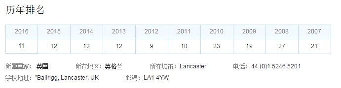 该校拥有英国最顶尖的环境科学系以及世界闻名的LUMS管理学院。其物理系在低温物理方面的研究也是国际领先。