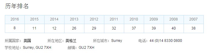 大学各专业均位于英国前20名,特别值得一提的是它的旅游管理和酒店管理专业在英国名列第一;电子工程与南安普顿大学并列第一;卫星工程、太空科技、计算机、土木工程等均名列前茅。