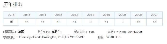 约克大学的教学和科研享誉国内外,是英国著名高等学府之一,教学质量在各项排名中都名列前十名。