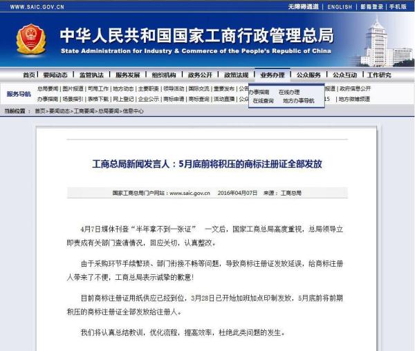 商标,是产品的身份证,是企业塑造自主品牌的名片,也是保护知识产权的法宝。可是从去年8月起,全国各地所有通过审核、经过公告的企业,却迟迟领不到一张盼望已久的商标注册证。经媒体调查,起因竟然是商标注册证的专用纸“没”了,打印不出来。昨天,国家工商总局回应证实,向商标注册人致歉,并表示纸张供应已经到位,将会加班加点,尽快印制发放。