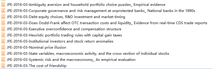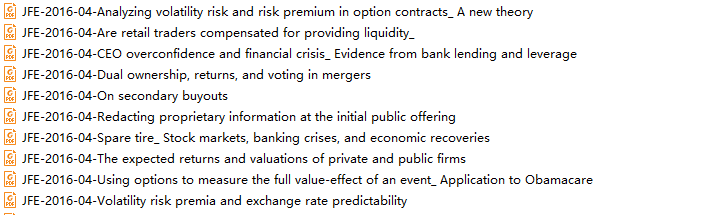 在论坛上会看到每天有人坚持分享纽约客,华尔街等报刊的,但好像就没有看到有人来坚持分享最新国外核心期刊论文的,不清楚这是为什么。开个头,以后定期分享国外核心期刊论文,了解最新国外研究动态。大家共同进步!图片是压缩文件内容截图(不定期分享最新国外核心期刊,国外最新working paper:JF,JFE,JBF,QJE,JFQA,RFS,NBER,SSRN等)