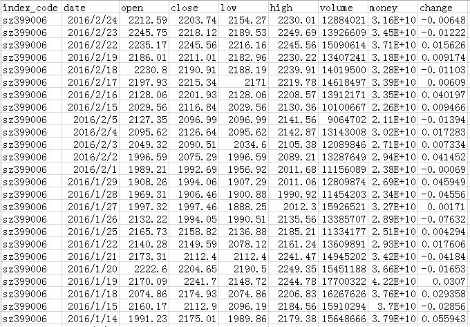 要用三大指数构造投资组合,首先需要指数的原始数据。在yucezhe.com的历史日线数据中,可以下载到所有指数历史至今的数据。如下图所示,每一行是每一天的数据: