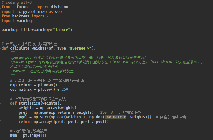 其中,在采用马克维茨的方法计算最优仓位的时候,我们的优化目标是最优夏普比例,也就是最大化期望收益/方差。在程序中也可以调整为最优收益或者最优方差。
