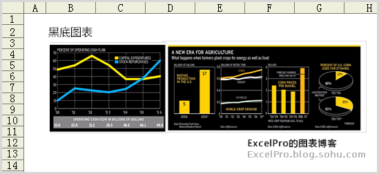 最为强烈的黑白对比,总是显得比较专业、高贵,黑底的图表其特点非常明显,但不要学麦肯锡的那一套,有些刺眼,也被它用滥了。