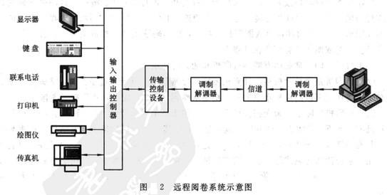 (1)远程批阅终端。远程批阅终端是一种专门配置在远地运行,并以联机处理方式向主机传输数据的终端设备,适用于批量作业处理的环境。图2所示为一个远程阅卷系统示意图。这类终端除具有输入、输出控制功能外,还具有数据缓冲及可编程等功能,因而可在本地完成包括传输控制、差错校验、码形变换等任务,不能处理的任务则交给远端的主机去完成。读卡机就属于远程批阅终端设备。